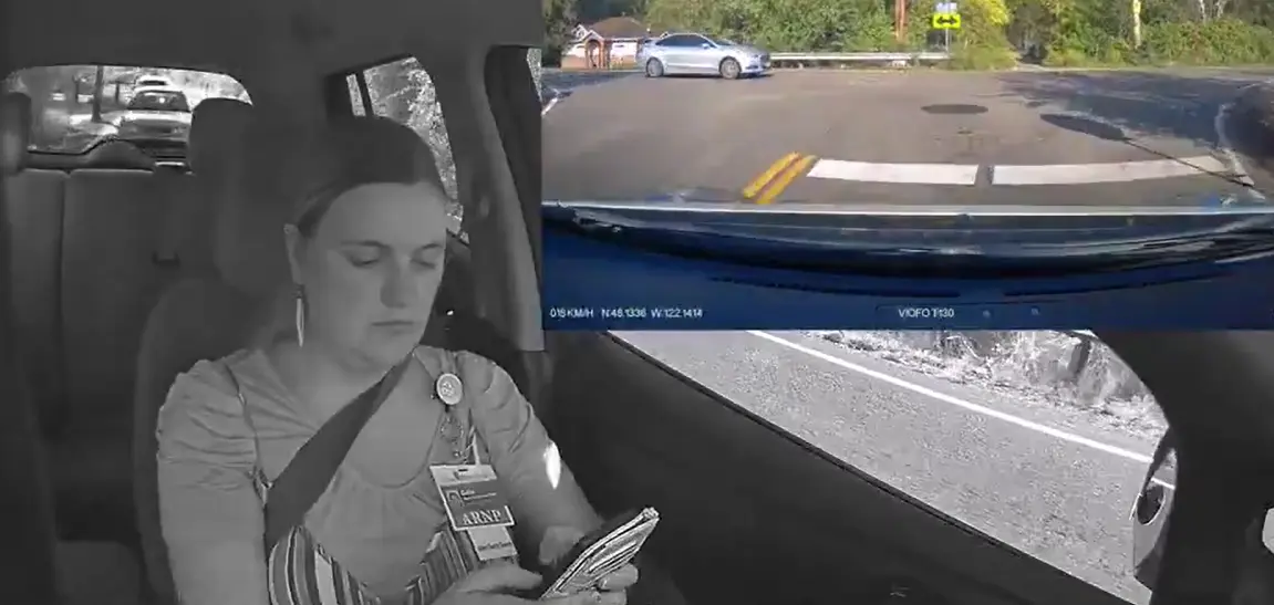 Las imágenes muestran a la conductora aparentemente distraída mientras manipula su teléfono móvil dentro del vehículo. En la toma frontal se observa cómo el automóvil se aproxima a una intersección sin que exista otro conductor realizando maniobras agresivas o forzándola a salir de la vía, lo que contradice su posterior testimonio.